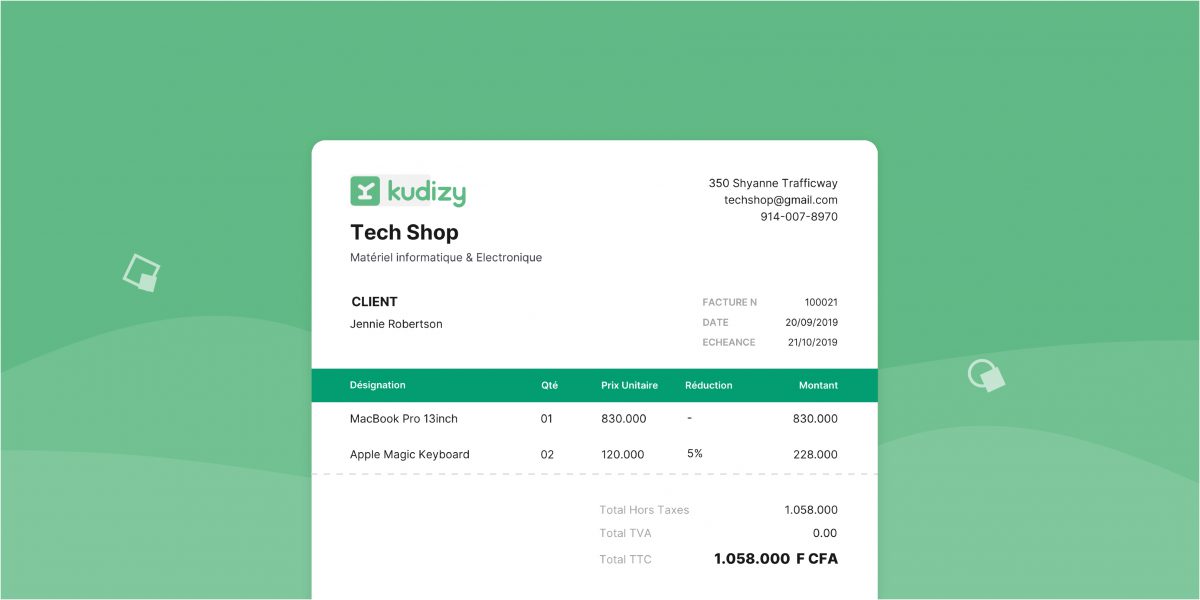 Kudizy est une application de gestion financière simplifiée qui vous permet de créer et envoyer des factures, enregistrer et traquer vos dépenses, gérer vos clients, etc. Grâce à ces modèles de factures normalisées préconçu, la création de facture à l’image de votre entreprise devient un processus (presque) automatique.